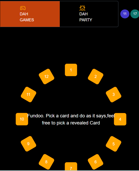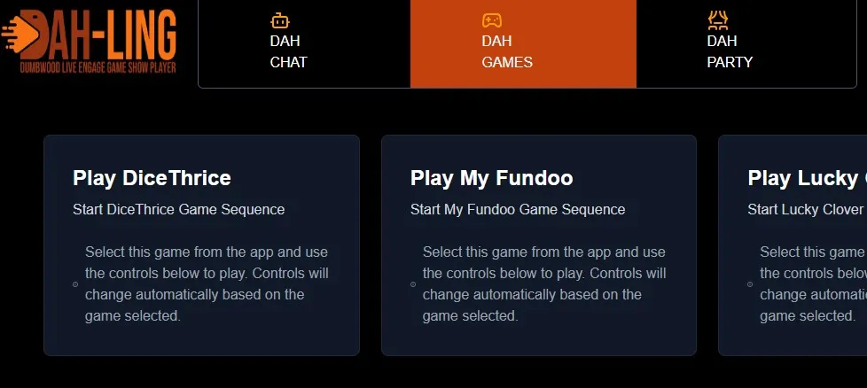 Each game can be played separately or tested separately. However to play this in sequence you will need a game show player. The gameshow Player will be called Dah-Ling. Dah for Dumb Ling for Live engage. Dah-Ling will display the play time, current score and cumulative score. Dah-Ling will have an option to pause the game show and resume the play. The Gameshow player will typically run on the Television. Before the game is played it will display code on the top. Controllers will need this code to connect to the game. Any number of controllers can join the game. Generally one or two per gathering can be used.