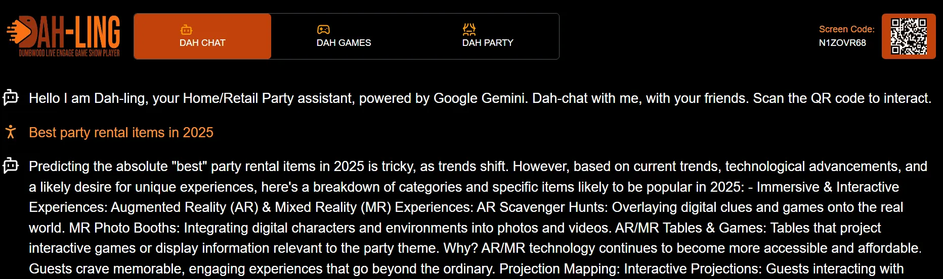 Aice breaker TopicDah-Chat now supports AIce Breaker Topic and can be used as a prompt engineering game. Given a topic, players will be required to ask a question about the topic. Players can use the same topic or change topic. One all the players are done asking questions. The player who had a relevant prompt that AI took the longest time to answer will be the winner. Prompt Topics can be random or a set of Pre defined Topics set by the Organizer..